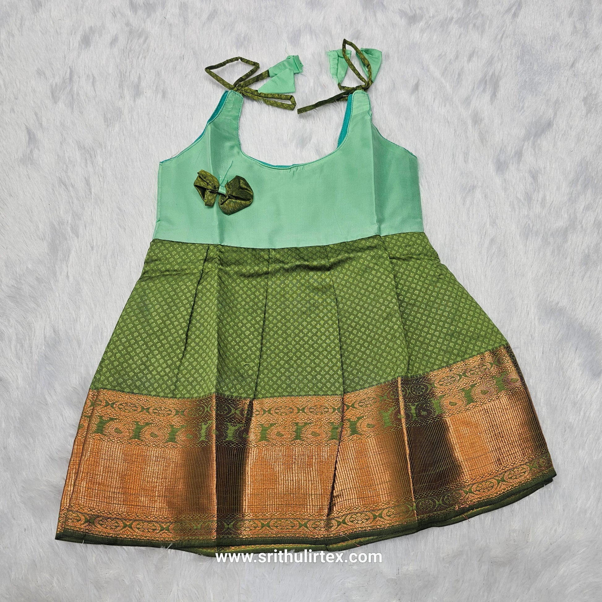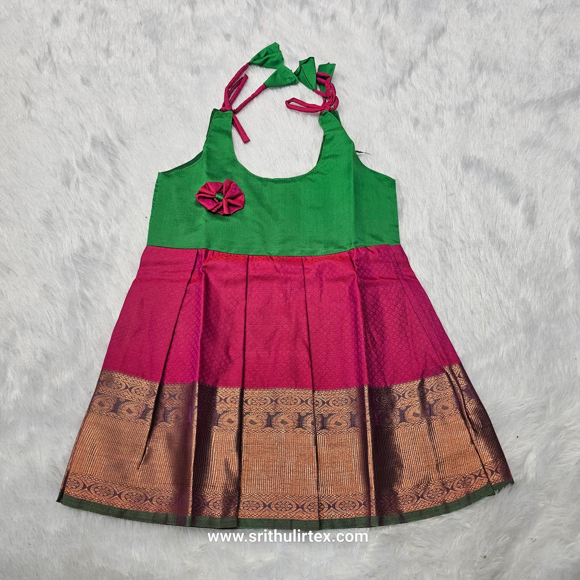 Premium semi silk baby frock for 7 Month To 12 month girls in a rich jacquard bottom with gold motifs. Rope-tie design, soft lining, and durable stitching. Perfect for weddings, festivals, and temple visits. Made in Tamil Nadu by Sri Thulir Tex.