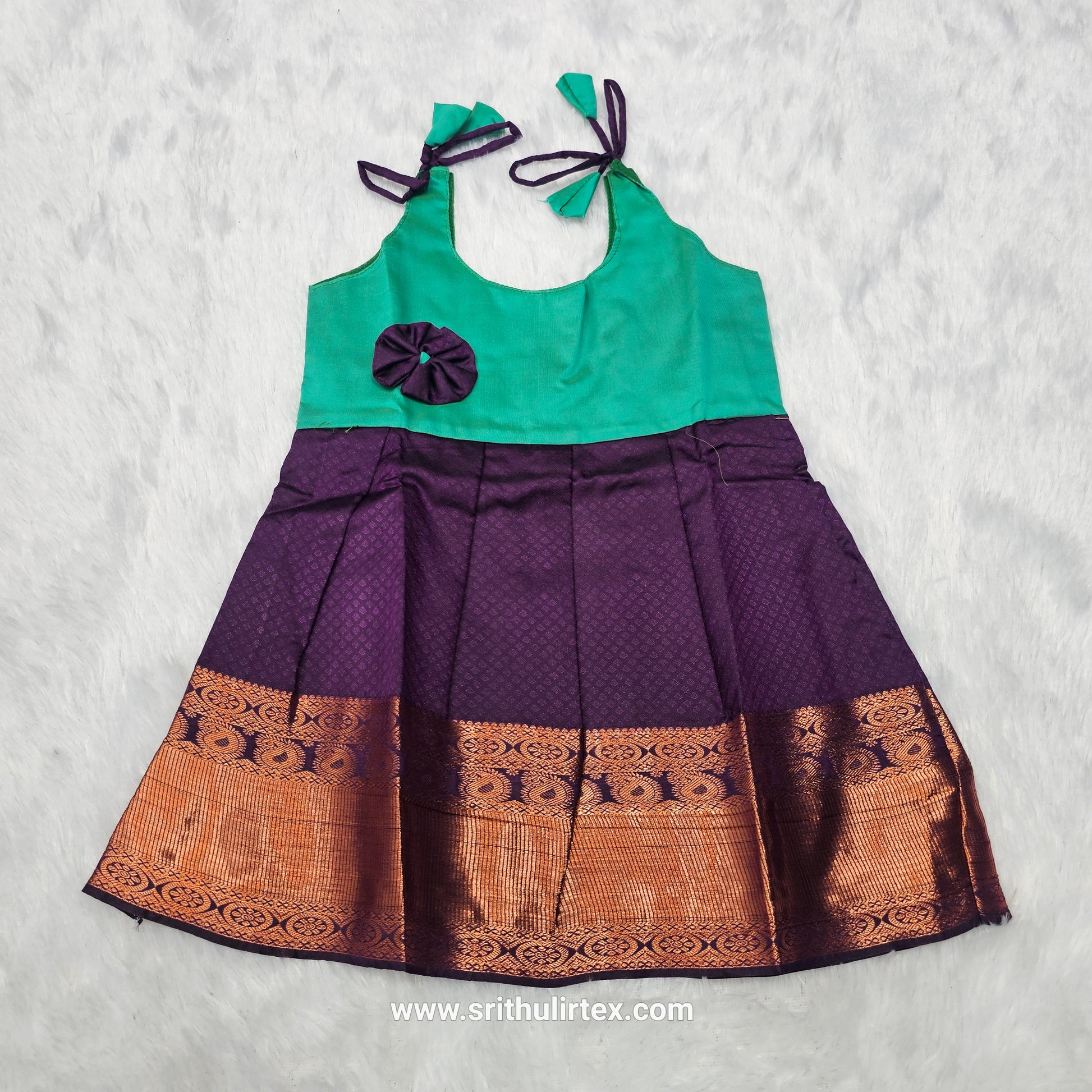 Semi silk baby frock, purple green baby dress, 7 Month to 12 month baby frock, traditional baby frock, pattu frock, jacquard baby dress, South Indian baby wear, Sri Thulir Tex, festival baby outfit