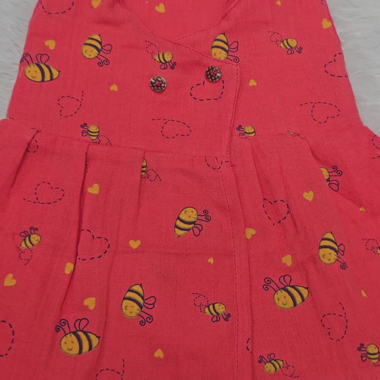 Beautiful coral muslin jabla frock with cute bee print and front open button design. Soft, breathable and perfect for newborn & 6 month babies. Made in Tamil Nadu by Sri Thulir Tex.