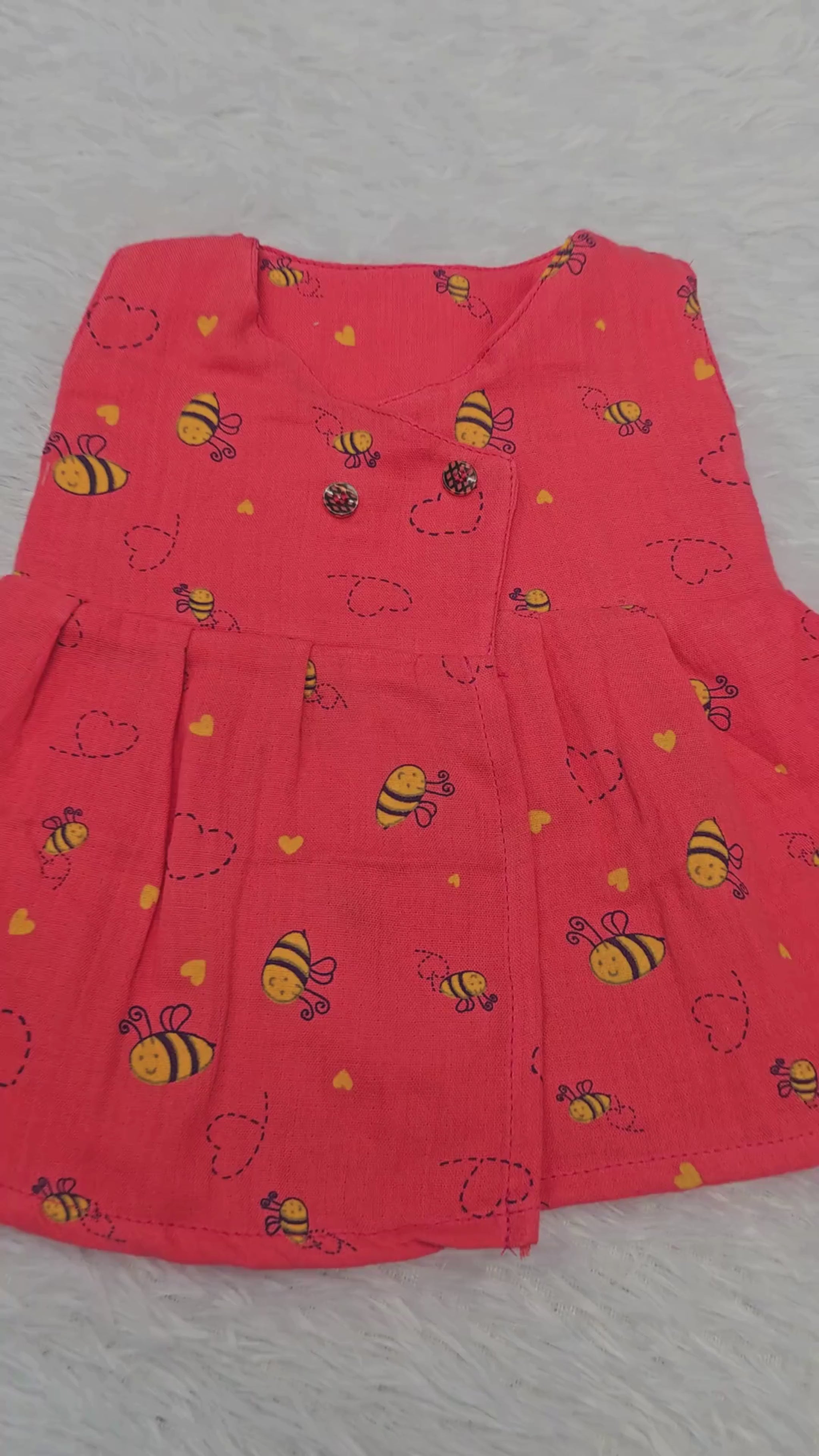 muslin jabla frock, front open baby frock, newborn muslin dress, bee print baby frock, coral baby frock, button jabla frock, Sri Thulir Tex babywear, breathable infant dress, 6 month baby frock India, cotton muslin baby clothing