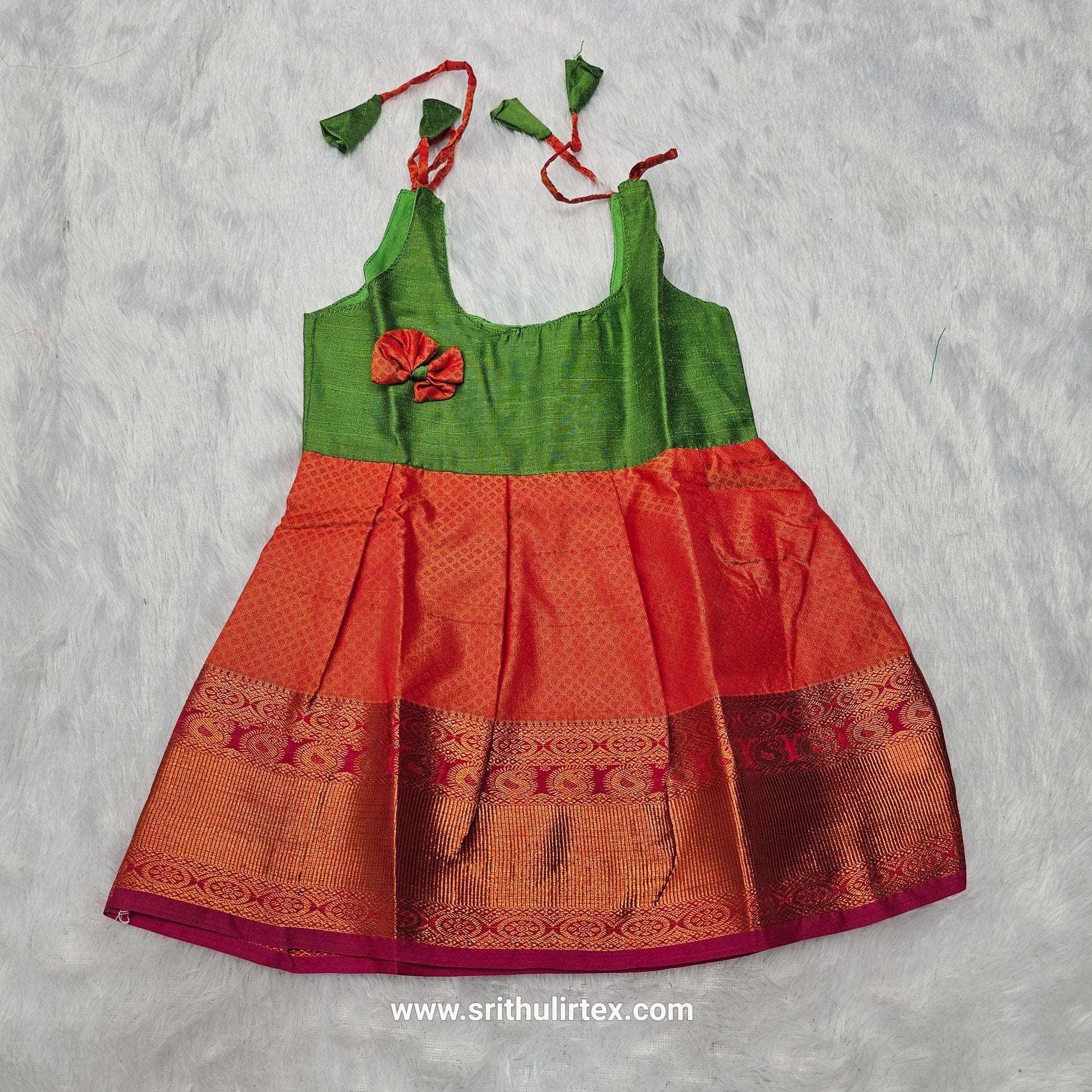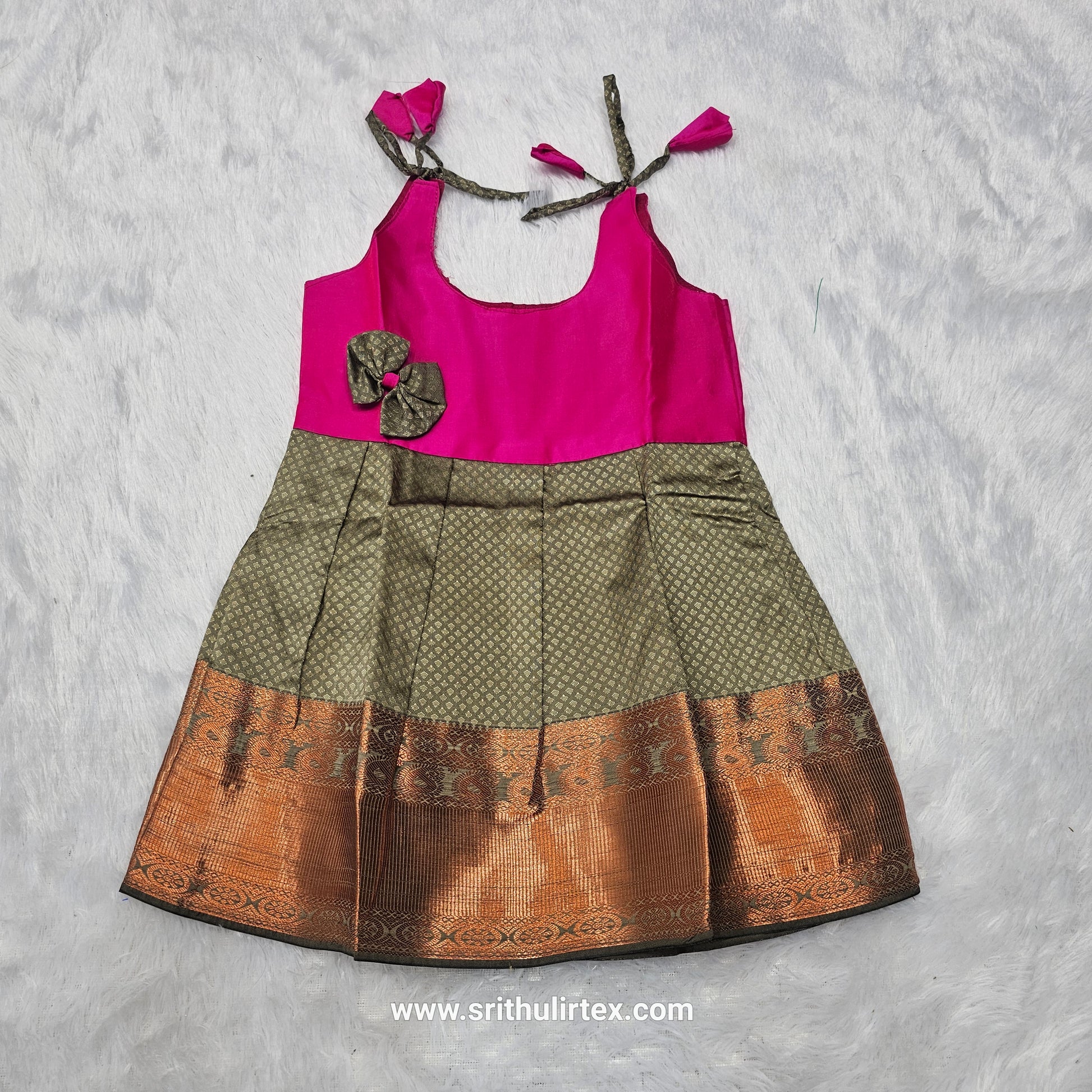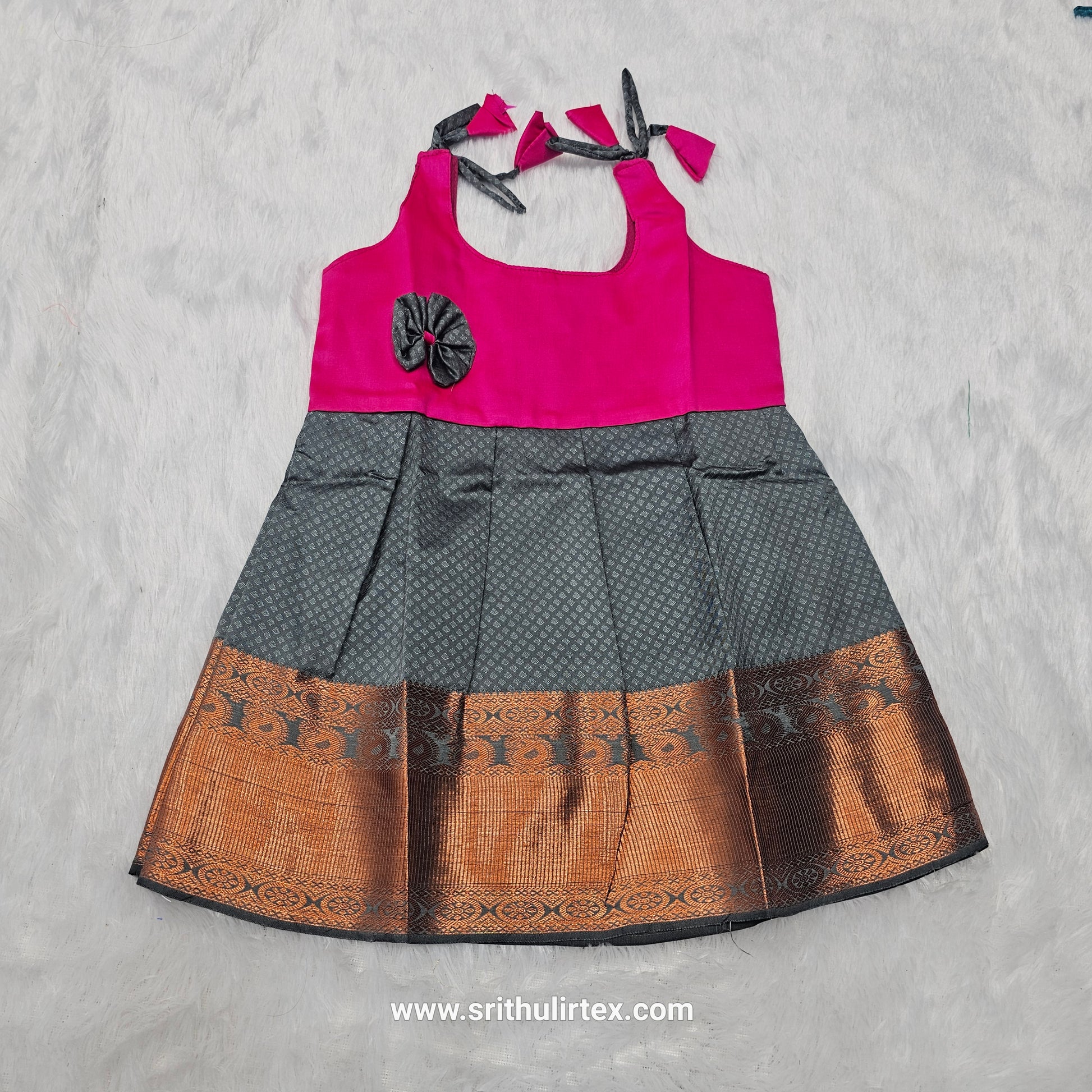 Premium semi silk baby frock for 7 Month To 12 month girls in a rich jacquard bottom with gold motifs. Rope-tie design, soft lining, and durable stitching. Perfect for weddings, festivals, and temple visits. Made in Tamil Nadu by Sri Thulir Tex.