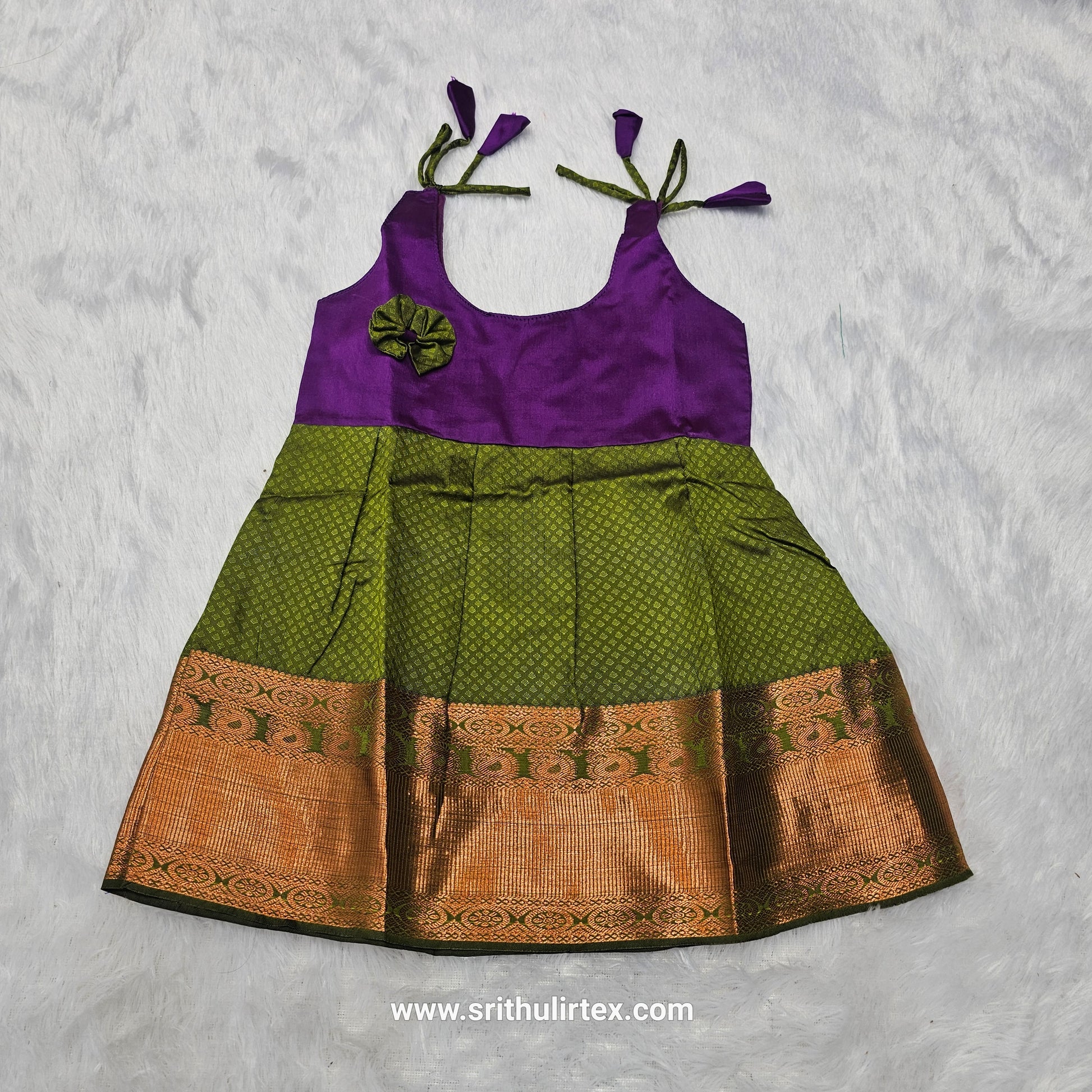 Semi silk baby frock, purple green baby dress, 7 Month to 12 month baby frock, traditional baby frock, pattu frock, jacquard baby dress, South Indian baby wear, Sri Thulir Tex, festival baby outfit